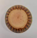 About MeEarthenware bowl with slightly curved sides and an everted flat rim. It is decorated on the exterior with vertical alternating bands of deep yellow ochre and brown glazes. The interior is decorated with swirling bands of deep yellow ochre and brown glazes spreading outwards from the centre. The flattened rim is incised with small wavy bands and then glazed in a mix of yellow, brown and green slips, with the green glaze flowing over the edge and around the underside.