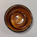 About MeEarthenware bowl with slightly curved sides and an everted flat rim. It is decorated on the exterior with vertical alternating bands of deep yellow ochre and brown glazes. The interior is decorated with swirling bands of deep yellow ochre and brown glazes spreading outwards from the centre. The flattened rim is incised with small wavy bands and then glazed in a mix of yellow, brown and green slips, with the green glaze flowing over the edge and around the underside.