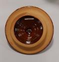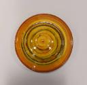 Both the jar and cover are wood-fired and glazed in yellow slip (liquid clay) over brown glaze. The jar is decorated with finger-combed wavy banding around the foot and free flowing hand-painted splashed loops of brown and green slips around the body. The cover is similarly decorated with light brown and green banding in concentric circles. Interior of jar and inside cover both glazed in dark brown.