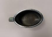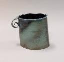 The vessel is glazed in a blue salt-glaze, becoming grey particularly around the handle. The exterior is also glazed in a dark brown and a mossy green metallic slip glaze, giving the surface a lustrous finish.