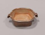 About MeStoneware rectangular press-moulded baking dish with two squashed loop handles with thumb print indentations applied to the longer sides of the dish.