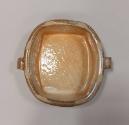 About MeStoneware rectangular press-moulded baking dish with two squashed loop handles with thumb print indentations applied to the longer sides of the dish.