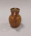 The jug is fully glazed in a speckled brown and grey-white slip and the exterior is glazed with a shiny brown slip around the collar and part of the handle with the remainder lightly salt-glazed in a pale brown colour.