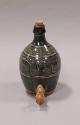 About MeStoneware bottle-shaped cider jar with round belly, tapering to foot and towards the shoulder which rises in a slim concave neck. Thick collar rim and pulled handle. A hole has been made towards the foot into which a turned wood tap (ABDMS095708.340.2) can be inserted. The hole is plugged with a cork circle to ensure a snug fit. There is also a cork stopper in the neck.