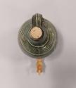 The cider jar is glazed all over in a blueish grey mottled ash glaze over a white slip with flecks of iron brown. It is decorated with combed waved bands and abstract swirls. Combing is a decorative technique where a comb of wood, or another material, is drawn through the slip before it is fully dry to create a pattern. This technique was frequently used at Winchcombe.