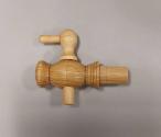 About MeStoneware bottle-shaped cider jar with round belly, tapering to foot and towards the shoulder which rises in a slim concave neck. Thick collar rim and pulled handle. A hole has been made towards the foot into which a turned wood tap (ABDMS095708.340.2) can be inserted. The hole is plugged with a cork circle to ensure a snug fit. There is also a cork stopper in the neck.