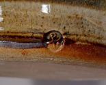 The cider jar is glazed all over in a blueish grey mottled ash glaze over a white slip with flecks of iron brown. It is decorated with combed waved bands and abstract swirls. Combing is a decorative technique where a comb of wood, or another material, is drawn through the slip before it is fully dry to create a pattern. This technique was frequently used at Winchcombe.