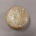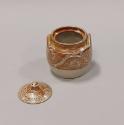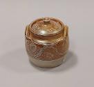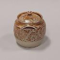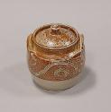 The jar is fully glazed in a cream oatmeal slip with tan brown slip around upper section of the body. Salt-glazed giving a speckled appearance. The cover is similarly glazed with cream oatmeal slip with tan over glaze on exterior which is also salt-glazed.