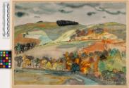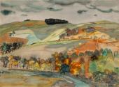 This watercolour shows a patchwork of fields in Heriot Valley, in the environs of Edinburgh. With consummate manipulation of paint and colour, Gillies has captured the aura of this particular place.