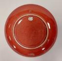 About MeStoneware circular shallow wheel-thrown dish with narrow foot ring. It is fully glazed in a light red copper glaze, with a pale blue-lilac mottled appearance on the upper surface.