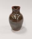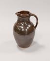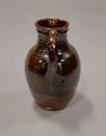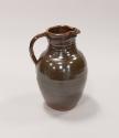 About MeTall stoneware jug with ovoid body and short concave neck. It has a rolled collar and rim with integral lip and a pulled short strap handle which sits high on the body.