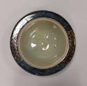 a pale olive green celadon glaze with dark blue celadon over glaze on the exterior.