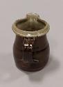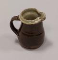The interior is glazed in a pale green ash glaze with pale green celadon pooling around the rim. The exterior body and handle are glazed in a rust brown iron (tenmoku) glaze.