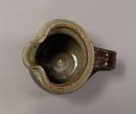 About MeStoneware small jug with gently sloping body rising to a pulled and flattened double rim with wide lip. Strap handle pulled from below the rim and terminating towards the foot if the body. Distinct potting rings around body.