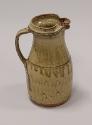 About MeStoneware medium jug with almost straight sided body rising to a long concave neck from a central rib. Pulled and flattened double rim with wide lip. Strap handle pulled from below the rim and terminating mid-body. Appears to thrown in two pieces, joined at the central rib before the handle was added.