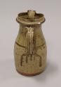 Glazed all over in a pale green ash glaze over a mid-brown glaze, possibly manganese, which gives a speckled appearance. Khaki green celadon glaze is brushed over the ash glaze, pooling around the rim, handle, central rib and towards the foot.