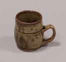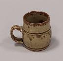 About MeStoneware small mug with rounded body rising to a short straight neck from a central rib. Rolled rim and small strap handle pulled from central rib to the foot.