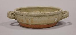 About MeStoneware two-handled baking dish with shallow sides, rolled rim and two pulled loop handles. Glazed in a pale green ash glaze under a pale green celadon glaze, which has pooled around the handles and inside.