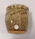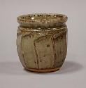About MeStoneware small cut-sided jar with thick rolled rim. It is glazed all over in a dark green ash glaze with manganese brown to create a soft mottled effect. The glaze has been wiped from the edges of the cut sections and around the rim to emphasise the shape. Cut facets are one of Richard Batterham's distinctive and dramatic ways to decorate a piece of pottery. He cut slices of clay away, often using a paint scraper as a tool, before the piece was glazed and fired in the kiln.