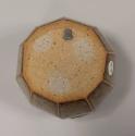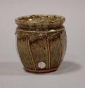 About MeStoneware small cut-sided jar with thick rolled rim. It is glazed all over in a dark green ash glaze with manganese brown to create a soft mottled effect. The glaze has been wiped from the edges of the cut sections and around the rim to emphasise the shape. Cut facets are one of Richard Batterham's distinctive and dramatic ways to decorate a piece of pottery. He cut slices of clay away, often using a paint scraper as a tool, before the piece was glazed and fired in the kiln.