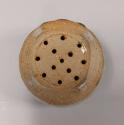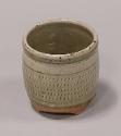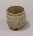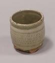 About MeStoneware small barrel-shaped jar with distinct collared and rolled rim. The jar stands on 4 integral feet with a pierced base. It may be intended to hold utensils or cutlery. It is glazed all over in a pale green ash glaze under a pale green celadon glaze. The ash glaze is partially wiped back around the rim to reveal the brown body beneath. Glaze stops short of the feet which are unglazed, as is the base.