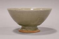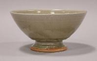 About MeStoneware medium footed bowl, or tazza, with a ringed and stepped foot. The bowl is glazed all over in a pale green celadon, which stops short of the base.