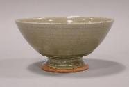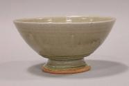 About MeStoneware medium footed bowl, or tazza, with a ringed and stepped foot. The bowl is glazed all over in a pale green celadon, which stops short of the base.