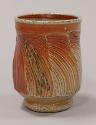 About MeStoneware beaker known as a 'guinomi', or sake cup, with facetted body, short concave neck, rolled rim and short rounded foot ring.
