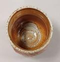 The sides of the vessel have been cut to create facets and then each facet incised with deep swirled cut decoration. Pale green slip has been applied to some of the cuts whilst others remain unfilled. A tan coloured glaze has been washed randomly over the interior and exterior before firing in a gas kiln with sodium vapour glaze. This process creates a 'orange peel' texture and warm body colour.