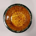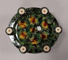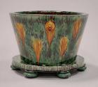 About MeThis earthenware oval jardiniere sits on an integrated oval stand with six circular short feet. It is decorated with a Whieldon style green glaze with running black speckles and yellow splashes.