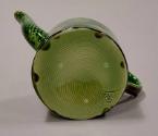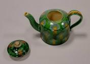 About MeThe brightly coloured design on this earthenware canister teapot is produced by painting latex patches over a base glaze and then spraying a different coloured glaze over the pot before picking off the latex. a third, very thin, glaze is then applied to create a high shine finish. Kevin de Choisy has also used a black scale pattern to emphasise the handle and spout.