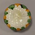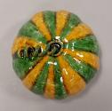 About MeThe brightly coloured design on this porcelain gourd is produced by painting latex patches over a base glaze and then spraying a different coloured glaze over the pot before picking off the latex. A third, very thin, glaze is then applied to create a high shine finish. Kevin de Choisy has chosen coloured glazes based on traditional earthenware ones used by Thomas Whieldon in the 18th century. Whieldon worked in Staffordshire and was famous for his splashed and spotted glazes which created a colourful tortoiseshell effect.