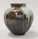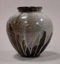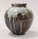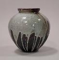 Large Black Stoneware Tsubo With Poured White Shino And Green Ash Running Glazes