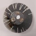 This black stoneware tsubo is decorated with poured white shino and green ash running glazes. Shino glaze is a traditional Japanese glaze which ranges in colour from milky white to orange. It is composed primarily of feldspar which is a rock-forming mineral consisting of aluminosilicates of potassium, sodium, and calcium.