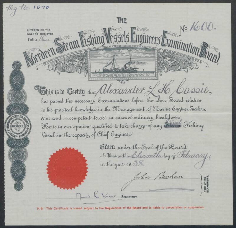 Aberdeen Steam Vessels Engineers Certificate for Diesel vessels