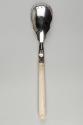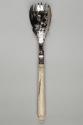 About MeOne of a pair of servers. The spoon has a pear shaped bowl engraved with foliate decoration on the inside. The fork has triangular toothed prongs. The handles of both are smooth ivory with finials.Both the silver and ivory in these pieces are finely detailed to suit late Victorian taste.