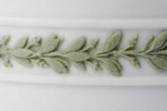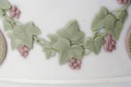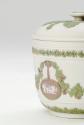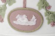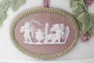 About MeWith the rise in popularity of the neo-classical style, Josiah Wedgwood developed a new ceramic material to complement the new fashions. Thousands of trials were carried out to make a stoneware body which could be stained throughout in suitable colours. By January 1775 he had perfected this new body which he called Jasper. This sugar basin and cover are in solid white jasper with green ivy festoons and purple berries, and stylised acanthus and stem ornament on the lid. On the body are two cartouches in the form of dark lilac ovals suspended from lilac ribbons and featuring bas-reliefs of classical subjects.