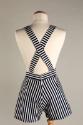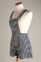 About MeThis navy and white striped playsuit comprises a bib attached to shorts with crossover adjustable straps that attach on to the front of the bib with white pearlised buttons. The bib, waistband and straps are lined with white nylon.