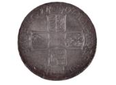 Reverse: 4 crowned shields bearing arms of Scotland, England, Ireland & France and with garter star in centre of design; coin has lettering on edge