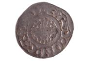 About MeObverse: crowned head facing; bearded face r.hand holding cross-headed mace is within circle of inscriptionReverse: short voided cross with quatrefoil in each angle