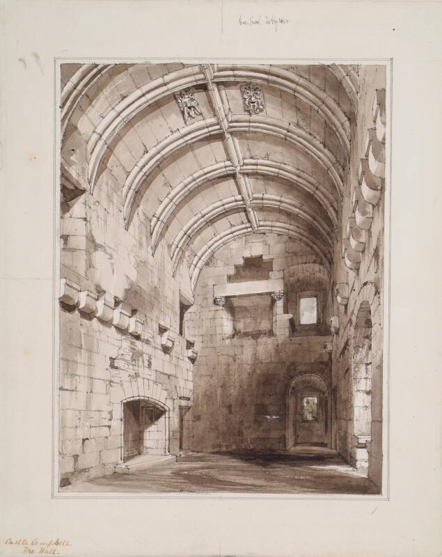 Campbell Castle is sometimes referred to as Castle Gloom, which seems at odds to this artwork which depicts the hall as grandiose with light and warmth once coming from the hearth.