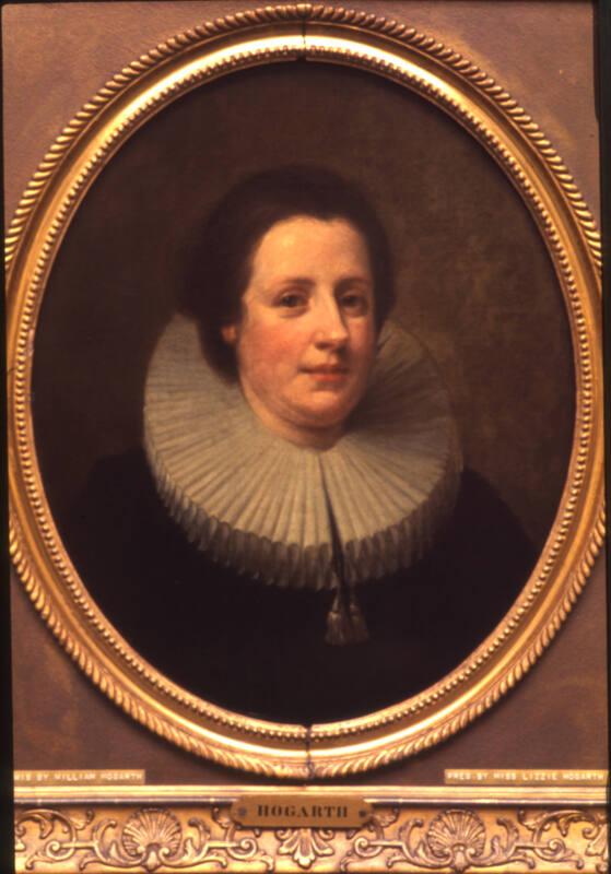 Hogarth portrays Mary Lewis in sombre, severe dress and stiffly starched ruff. Such costume was not the fashion of mid eighteenth century England (this painting probably dates from c. 1750). Hogarth borrowed these items, and his use of strong light on the face set against a gloomy background, from Dutch 17th century art, then as now, much in favour. Some of the paintings of Rembrandt van Rijn were already in Britain at this date and his influence on Hogarth seems to have been fundamental to this, and several other of his portraits of the 1750s.