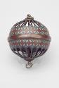 About MeA cloisonné spherical censer made of metal and enamel consisting of an open work ball, made in two halves, each containing metal loops which move inside each other with a band of cloisonné around the middle and with two loops at apexes. The powdered incense was lit and remained stable due to the rolling mechanism which prevented it from falling out.James Cromar Watt
