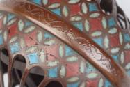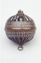 About MeA cloisonné spherical censer made of metal and enamel consisting of an open work ball, made in two halves, each containing metal loops which move inside each other with a band of cloisonné around the middle and with two loops at apexes. The powdered incense was lit and remained stable due to the rolling mechanism which prevented it from falling out.James Cromar Watt
