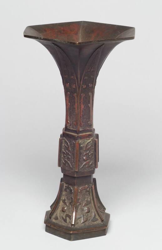 About MeThis tall, six-sided, slim Chinese vase is cast from bronze. It has a flared trumpet and the shaped top features abstract shapes and archaic characters. The 'gu' is one of the most ancient forms of ritual vessel.James Cromar Watt