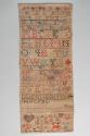The upper section comprises alphabets, numerals and family initials interspersed with bands of various stitch patterns.