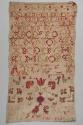 The lower section comprises various motifs including tulips in a vase, carnations, birds, a stag, a dog, cockerels. and family initials.