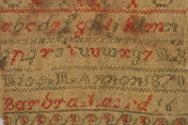About MeThis linen cross stitch and eyelet stitch sampler was made by Barbra Laird aged 16 years in 1870.