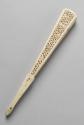 About MeLadies cream pierced ivory fan comprising sticks in two main parts, a lower lightly inversed elongated tear drop section, with a simple pierced motif at the juncture where the stick forms a flat spatula, heavily pierced forming an intricate repeating arabesque style geometric motif across the mount of the fan, which is fully appreciated when the fan is open out fully. The sticks are attached and threaded near top with a cream silky ribbon, forming a plain band across the pierced motifs.