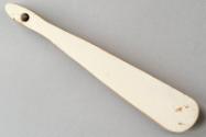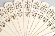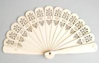 About MeLadies simple white wood fan style comprising thirteen central rounded topped sticks with a simple repeating pierced design near the top of each one. There are two further plain sticks at either end forming the fan guard when shut.